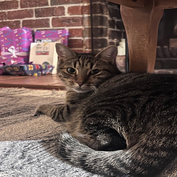 When he is settled he lies down under a chair and allows us to pat him, purring loudly!